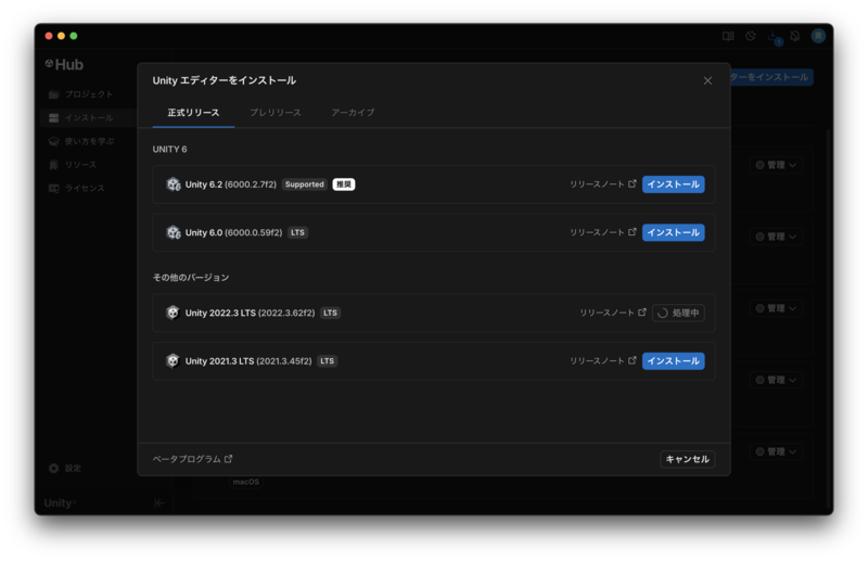 今回はUnityの正式リリース欄に対象バージョンがあったので、「インストール」を選択します。